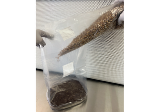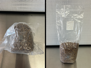 2. Break up your colonized grain bag by firmly pressing it against a flat surface. Ensure all chunks are broken up and mix the bag thoroughly.