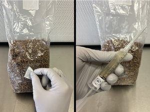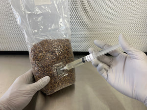 5. Carefully insert the needle into the injection port and inoculate the bag with 5-10ml of liquid culture or spore solution.